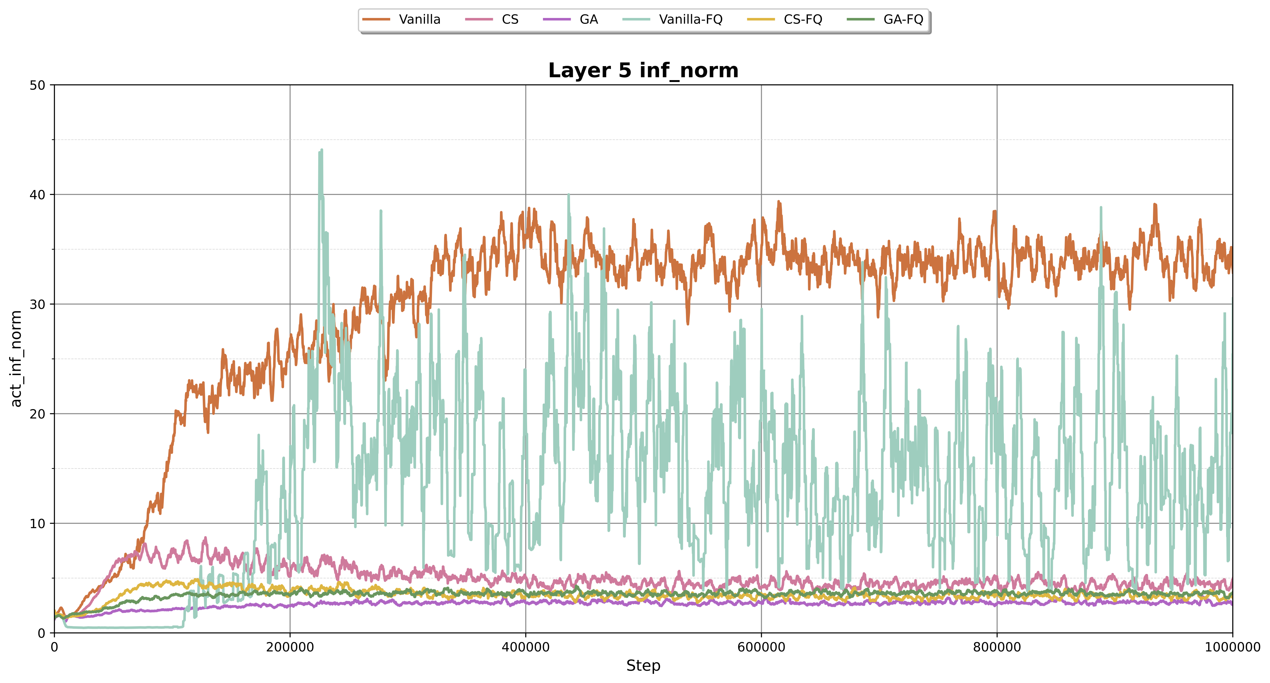 To understand the root cause of the instability observed in vanilla-FQ, we analyze the magnitude of activations in the Transformer block by measuring the \(\|X\|_{\infty}\) of input to model layer. As shown in Figure 6, the baseline vanilla model trained with quantization exhibits extremely high norm values, which are significantly larger than those of any other variant.
