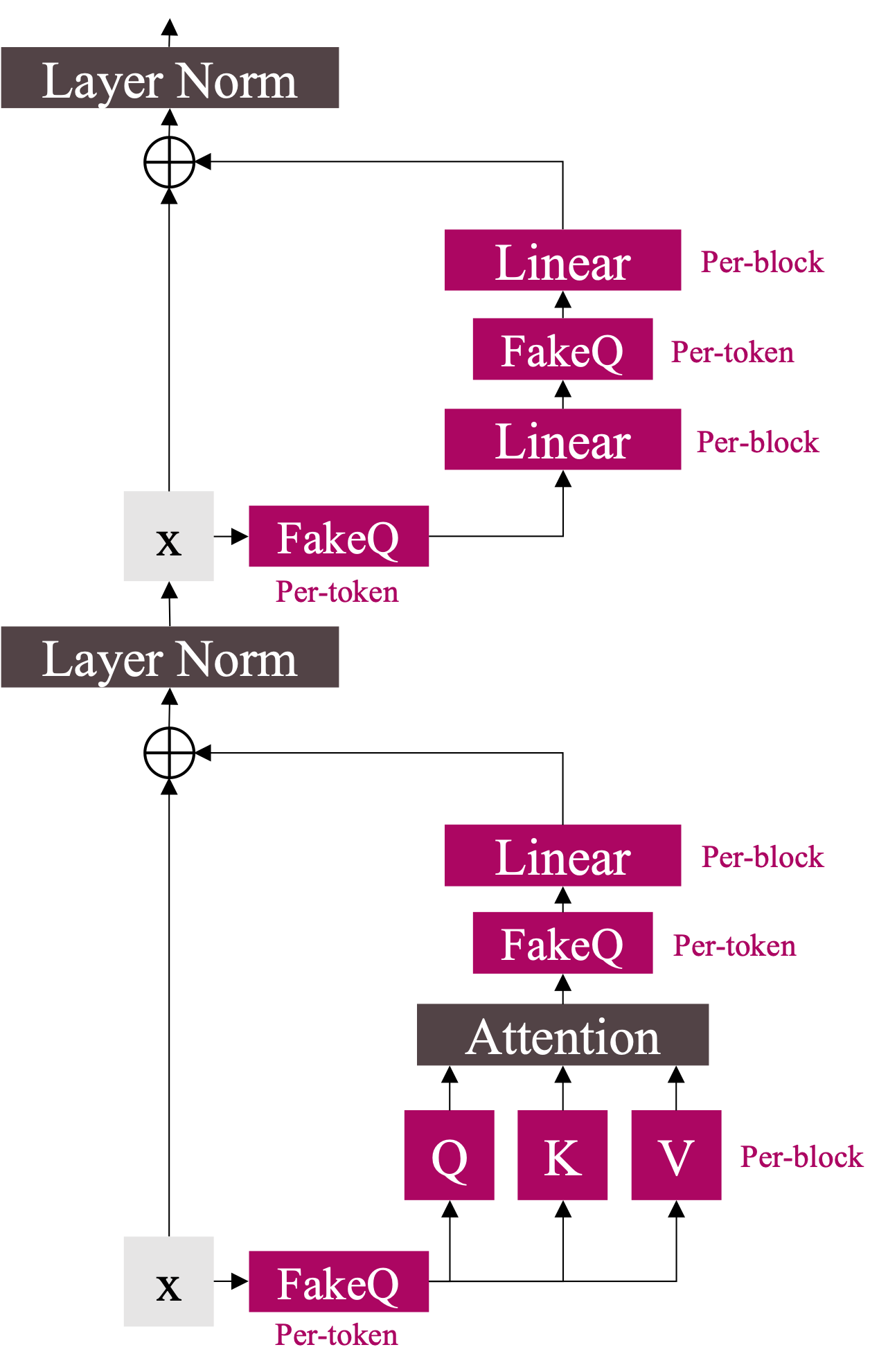 To test this hypothesis, we applied fake quantization during the forward pass (the backward pass is beyond the scope of this posting). Figure 4 illustrates a Transformer model with fake quantization applied. We insert fake quantization blocks into all matrix multiplication operations. Since activation outliers tend to appear in a channel-wise fashion, per-channel quantization is generally preferable. However, to clearly highlight the effects, we applied per-token quantization